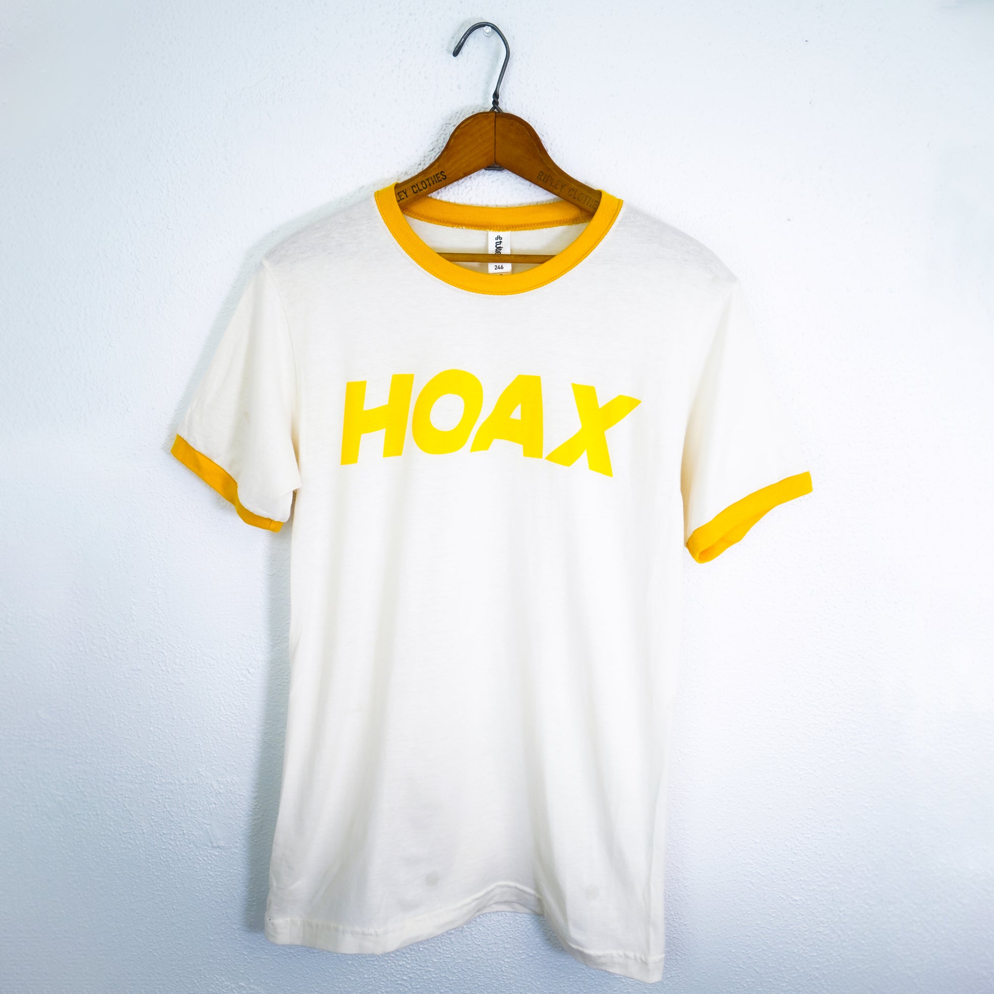 - 'HOAX' boldly printed in Yellow font for a statement-making effect